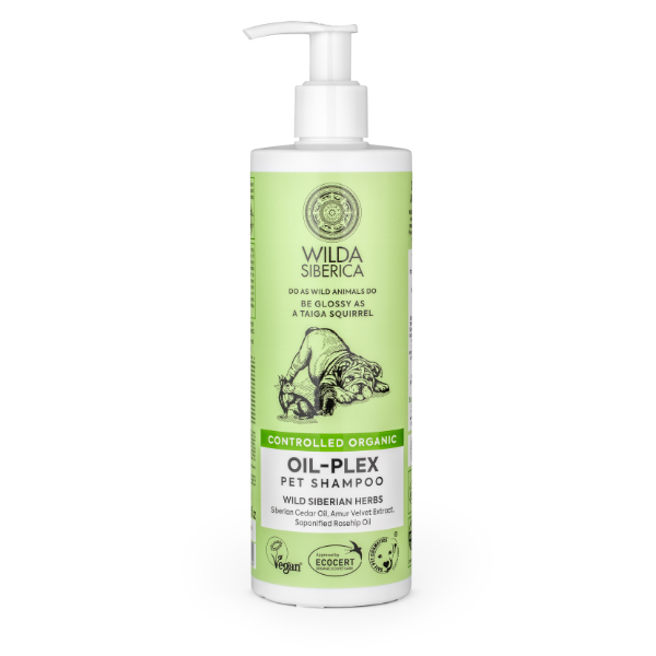 Champú para mascotas con pelajes secos y frágiles que necesitan brillo, con aceite de piñones del Cedro Siberiano que hidrata la piel, restablece la estructura del pelaje y le otorga brillo al pelo de la mascota.
